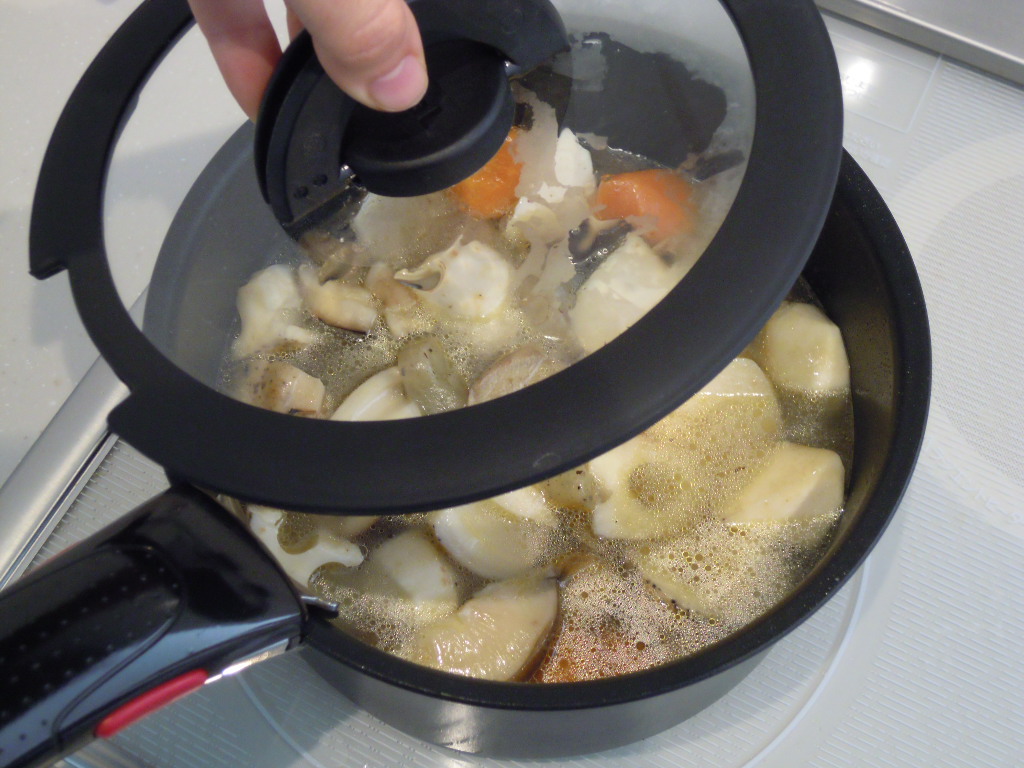 しいたけがしんなりしたら昆布だしを加え、ふたをして弱火で煮る(20~40分)。