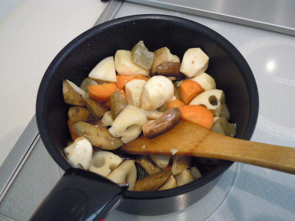 • 茹でて皮をむいた場合は里芋は油で炒めず、工程③で高野豆腐といっしょに加えてください。