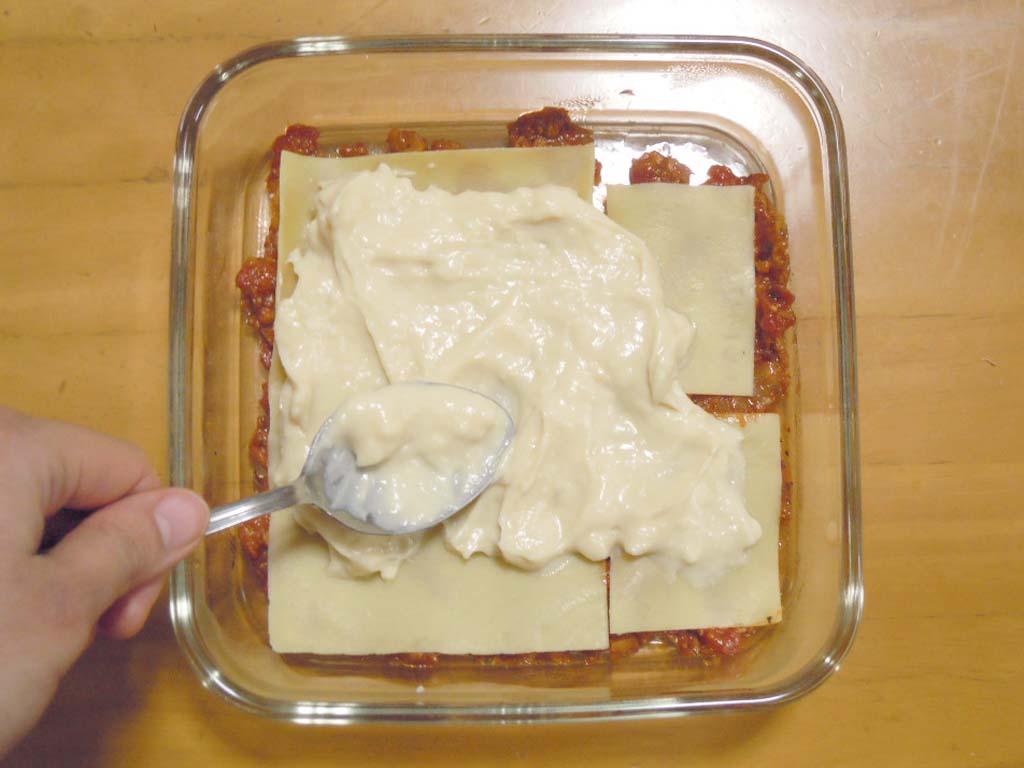 野菜のミートソースと豆乳ホワイトソースで作る、植物性食材100%のラザニア。