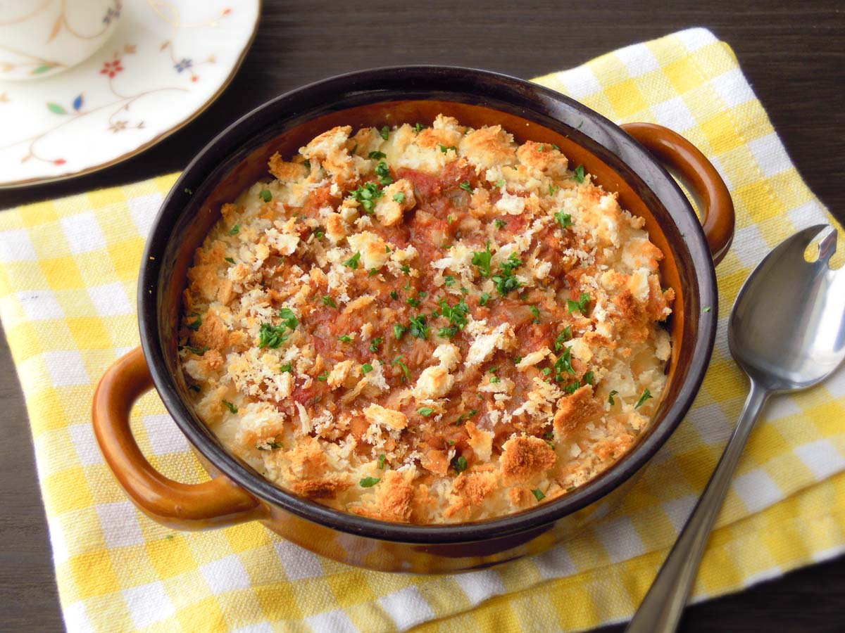 焼き上がったらお好みで乾燥パセリを散らし、スプーンやナイフでお皿に取り分けて食べる。