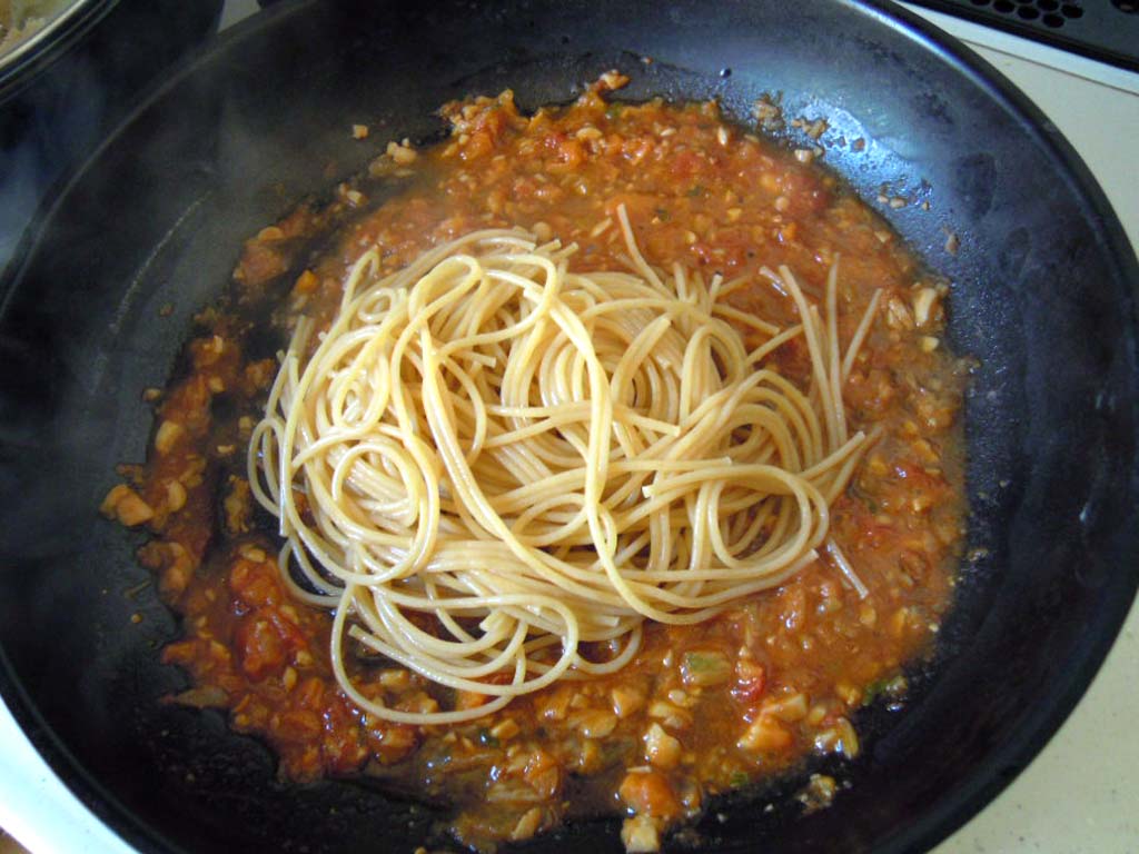 0.5%の塩を加えたお湯(水1リットルあたり塩小さじ1)で全粒粉パスタを袋の表示時間通り茹で、ざるに上げて水気を切る。