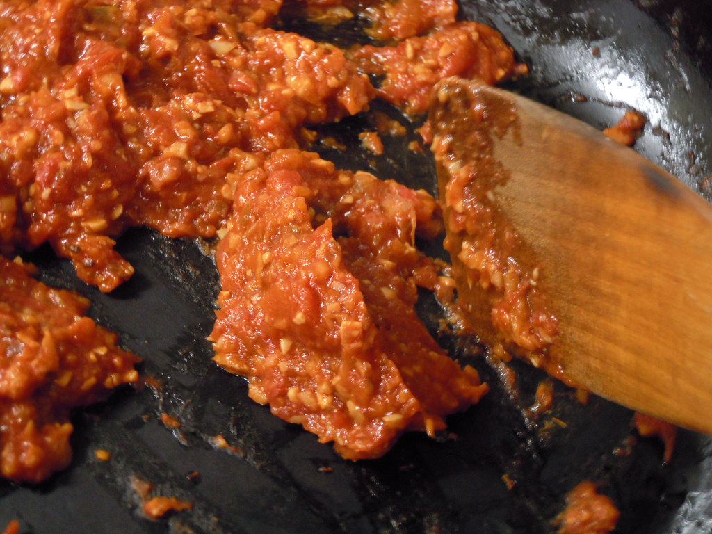 れんこん、Aを加え、ヘラでときどきトマトを潰しながら中弱火〜中火でじっくり煮詰める。ローリエは途中で取り除く。